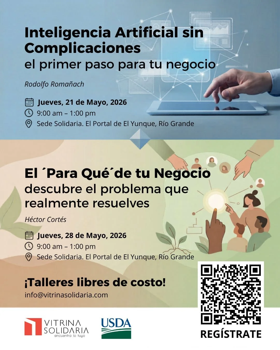Este esfuerzo de Vitrina Solidaria Inc. busca brindar capacitación y apoyo técnico a emprendedores y pequeños negocios mediante talleres de diversos temas relacionados con las áreas de Permisología y Finanzas. Los talleres tendrán una duración de 4 horas cada uno y se impartirán en modalidad presencial en los municipios de Luquillo, Fajardo, Ceiba y Naguabo, durante los meses de abril a octubre de 2025. Los talleres de Permisología se realizarán de abril a julio de 2025 (fechas y horarios se publicarán oportunamente).